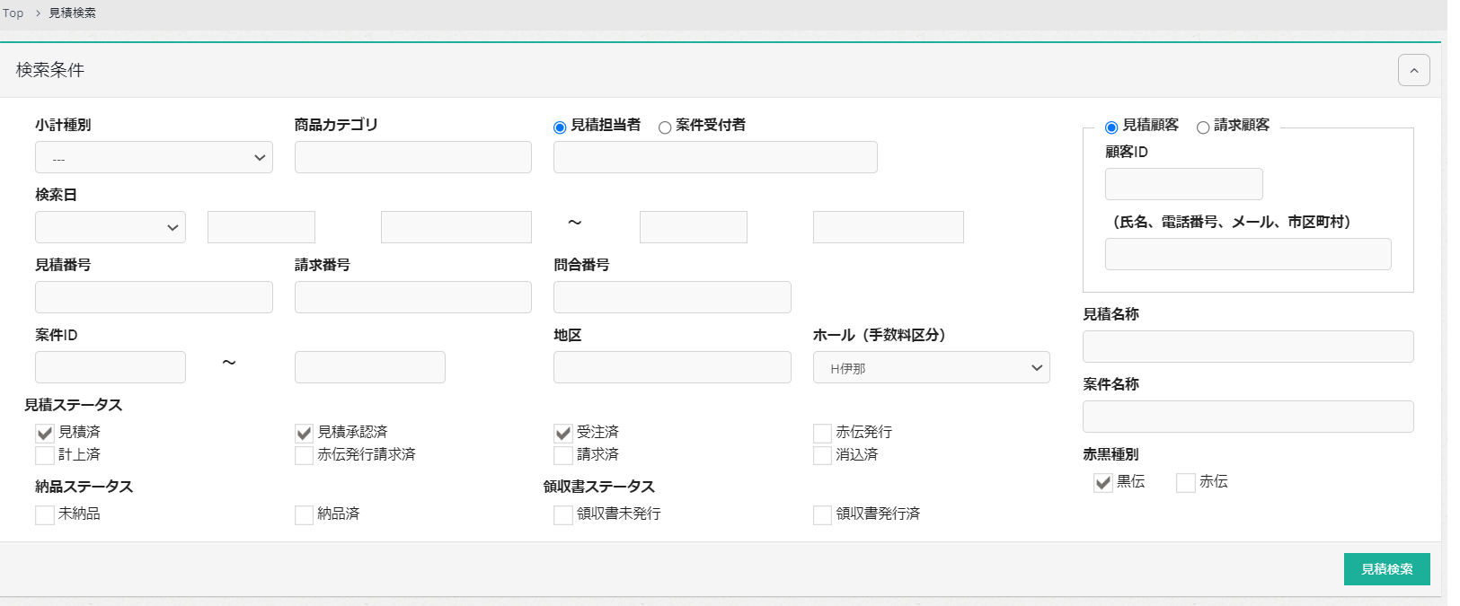 入力欄で検索条件を指定した後 「見積検索」ボタンを押すと、検索条件に一致する案件の一覧を表示します。