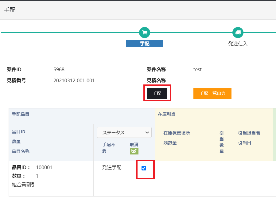 取消ボタンにチェックを入れて手配をクリックすると取消できます。