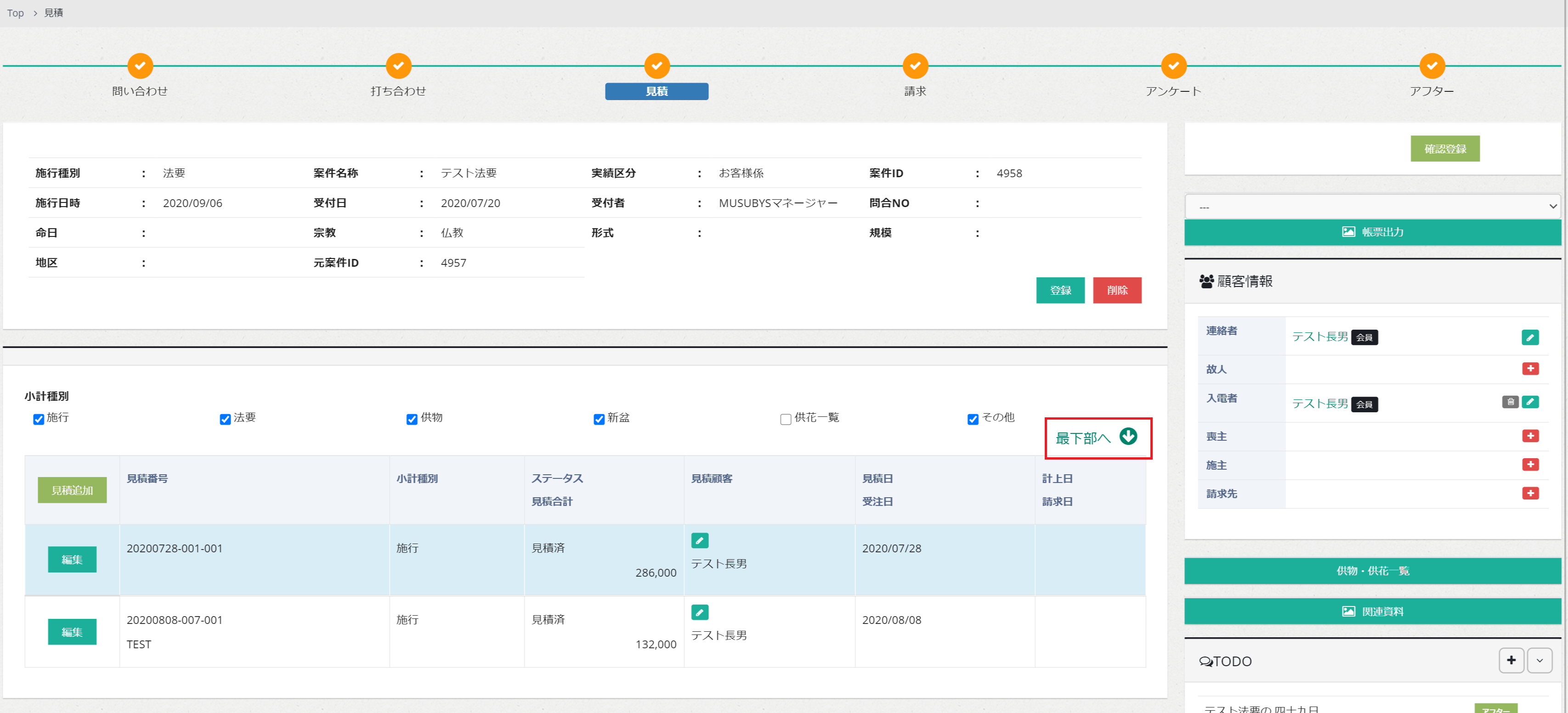 作成した見積の一覧です。薄い青色がついている見積が、現在選択されている見積となります 「最下部へ」ボタンでページの一番下へ、