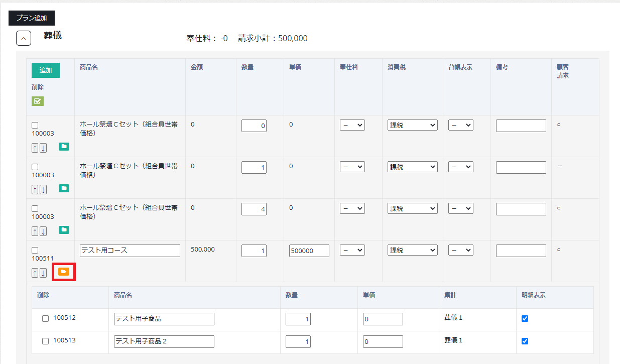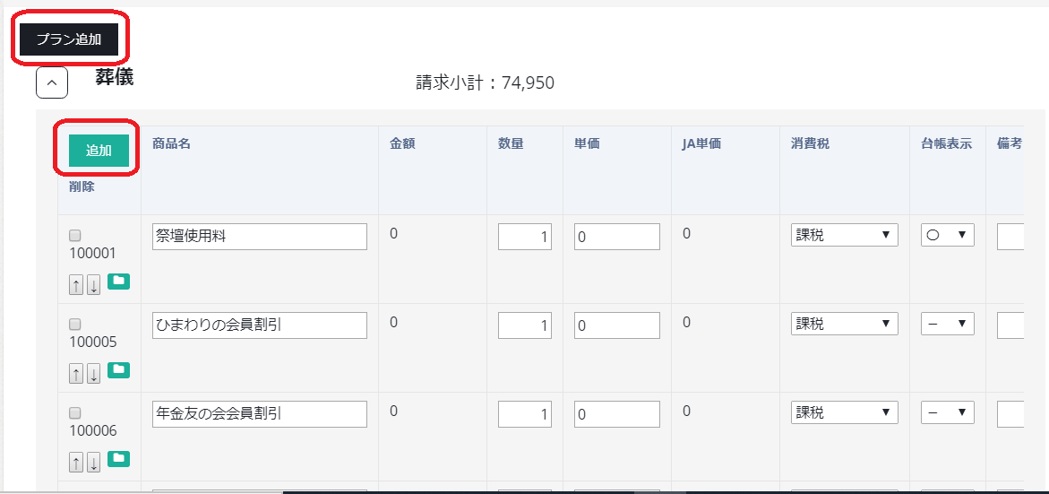 プラン追加ボタンをクリックすると、プランマスタ画面から作成したプランを入力することができます