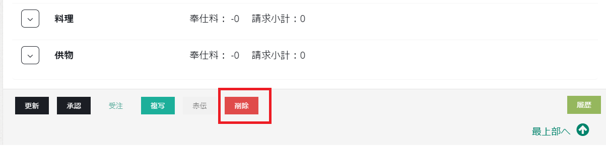 誤って見積を作成した際に、データを削除することができます。以下の削除ボタンをクリックしてください。「見積済」ステータス(見積承認前)であれば削除可能です。見積承認後は削除できません。