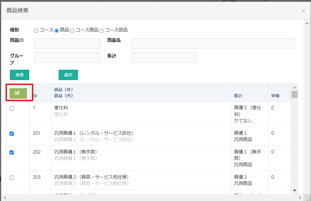 チェックボックスで複数選択することも可能です。モーダル右下の選択をクリックすると、商品が選択された状態になります