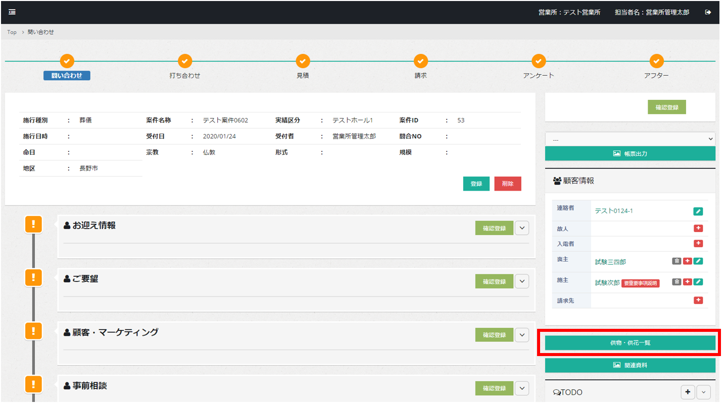 供物・供花一覧の画面は案件の右側サイドメニューの「供物・供花一覧」ボタンクリックすることで表示できます。