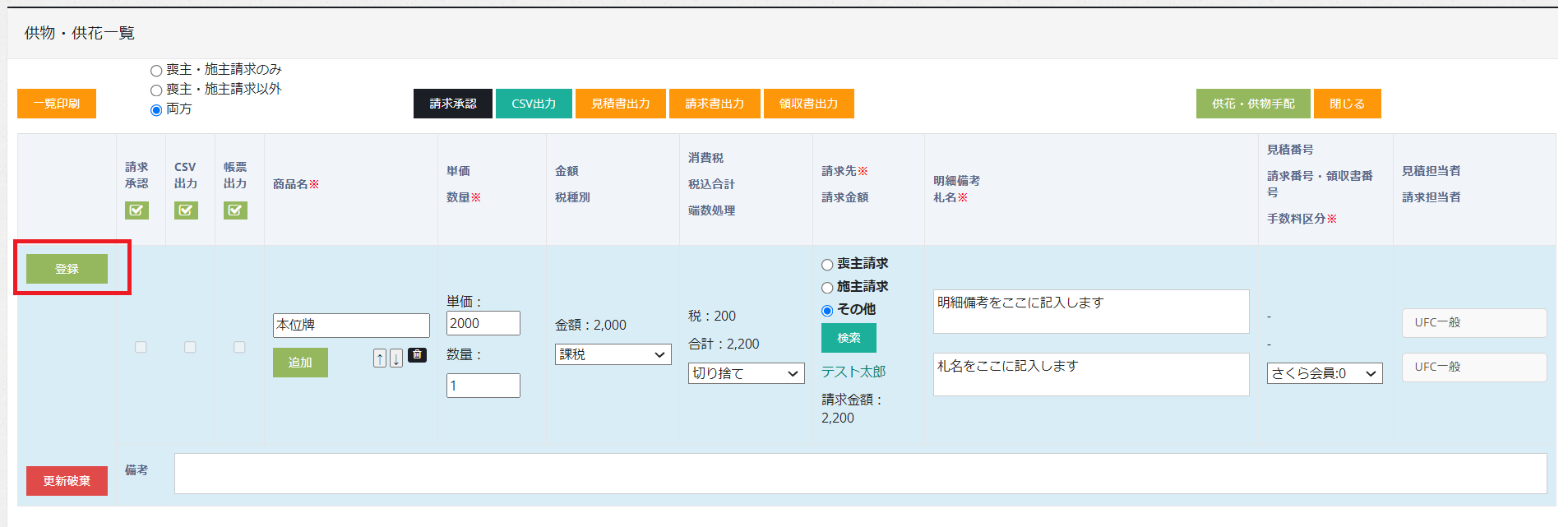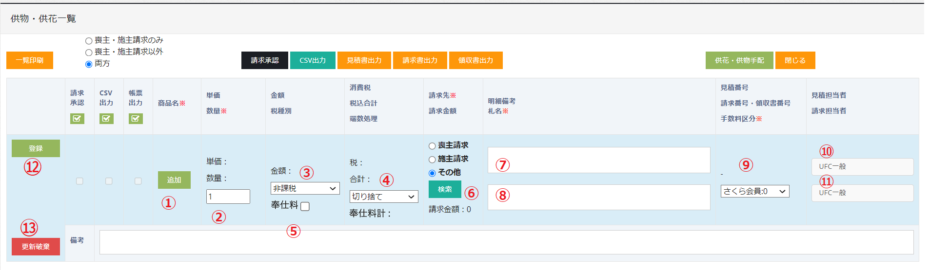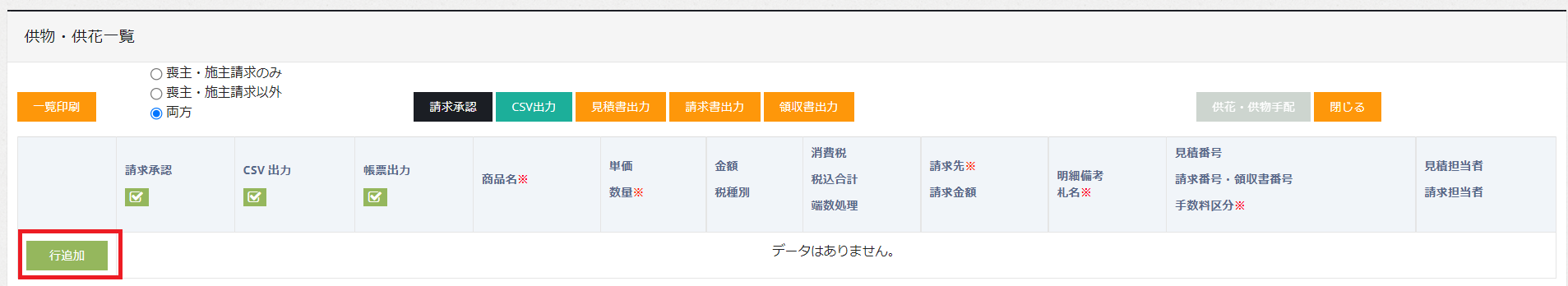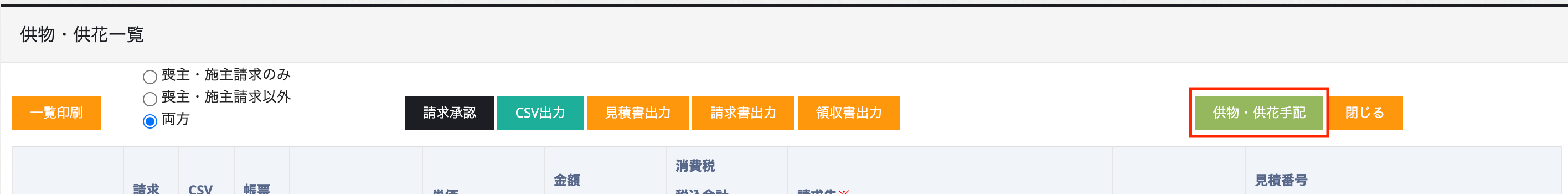 供物・供花一覧機能は、供物・供花の見積・請求を一画面の一覧で作成できる機能です。