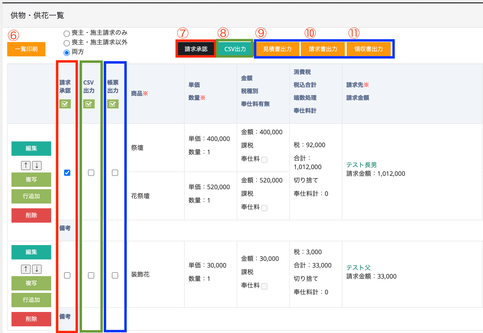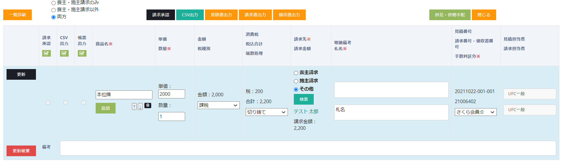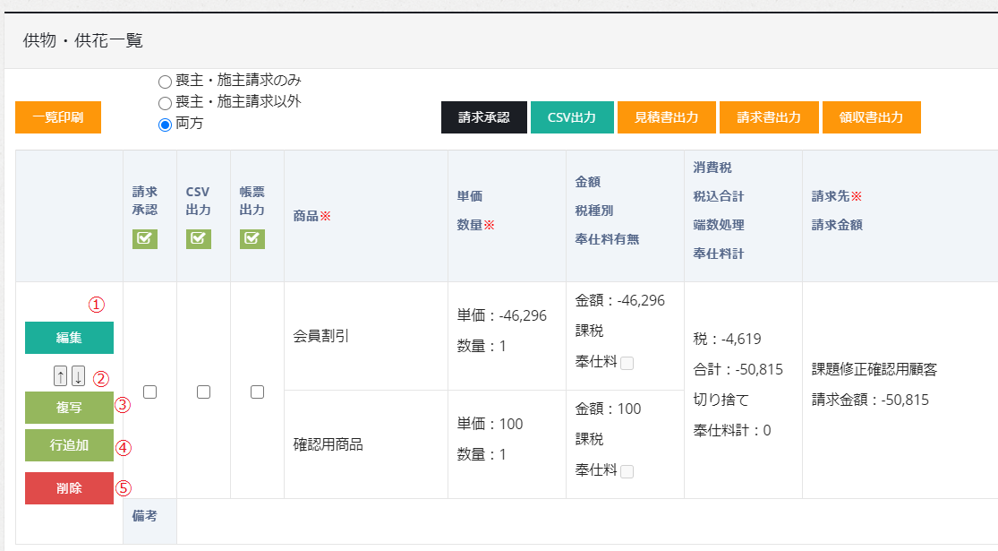 供物・供花一覧機能は、供物・供花の見積・請求を一画面の一覧で作成できる機能です。
