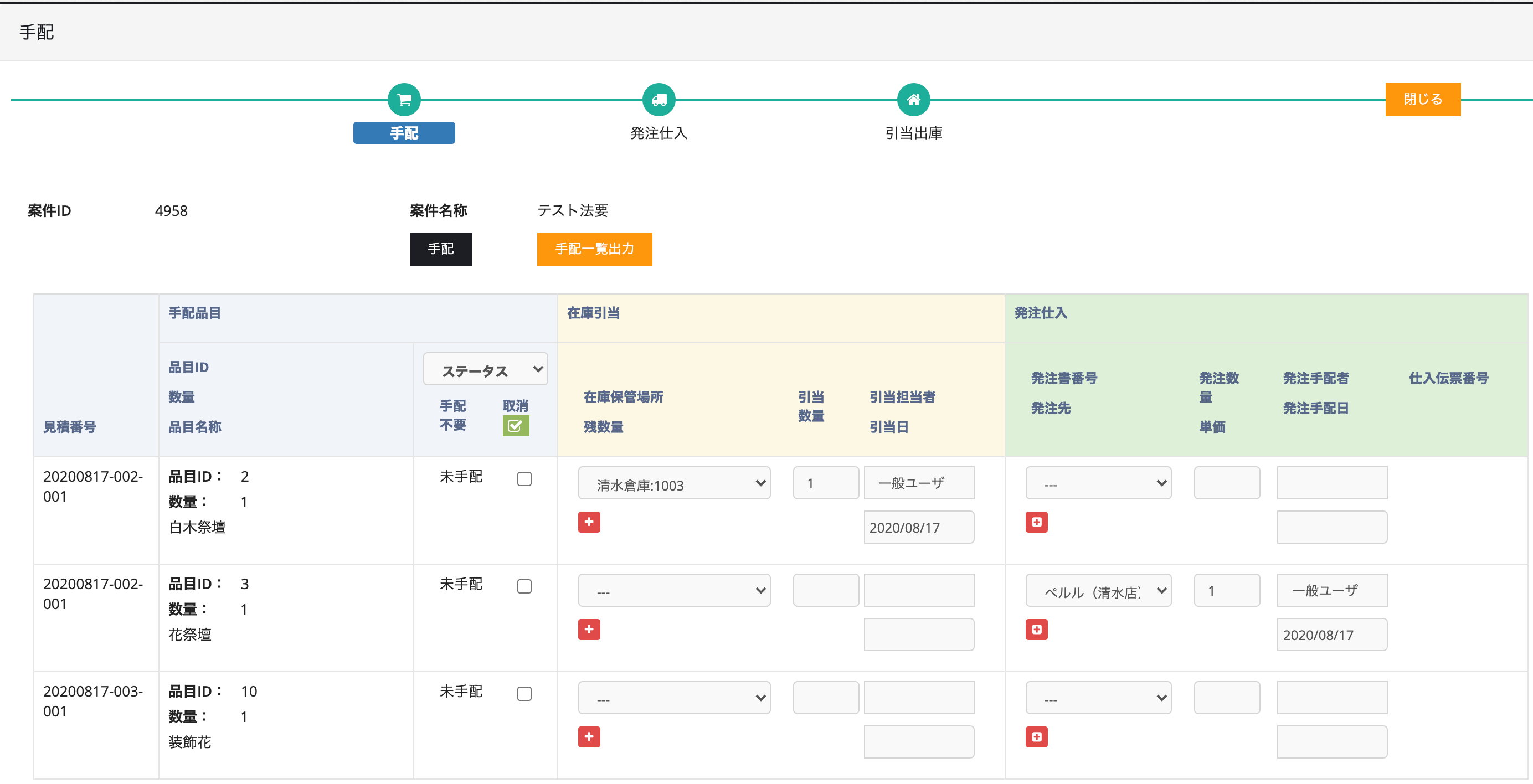 供物・供花の手配は手配・発注仕入・引当出庫に記載の通り進めることができます