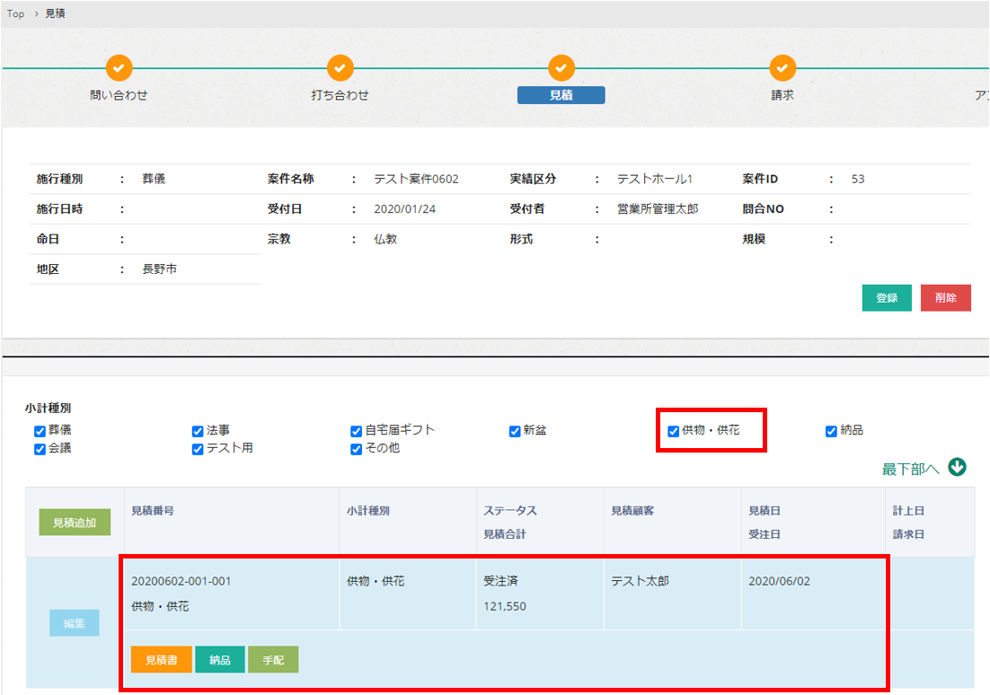 供物・供花一覧から作成した見積に対し見積画面からは以下の操作が可能です。