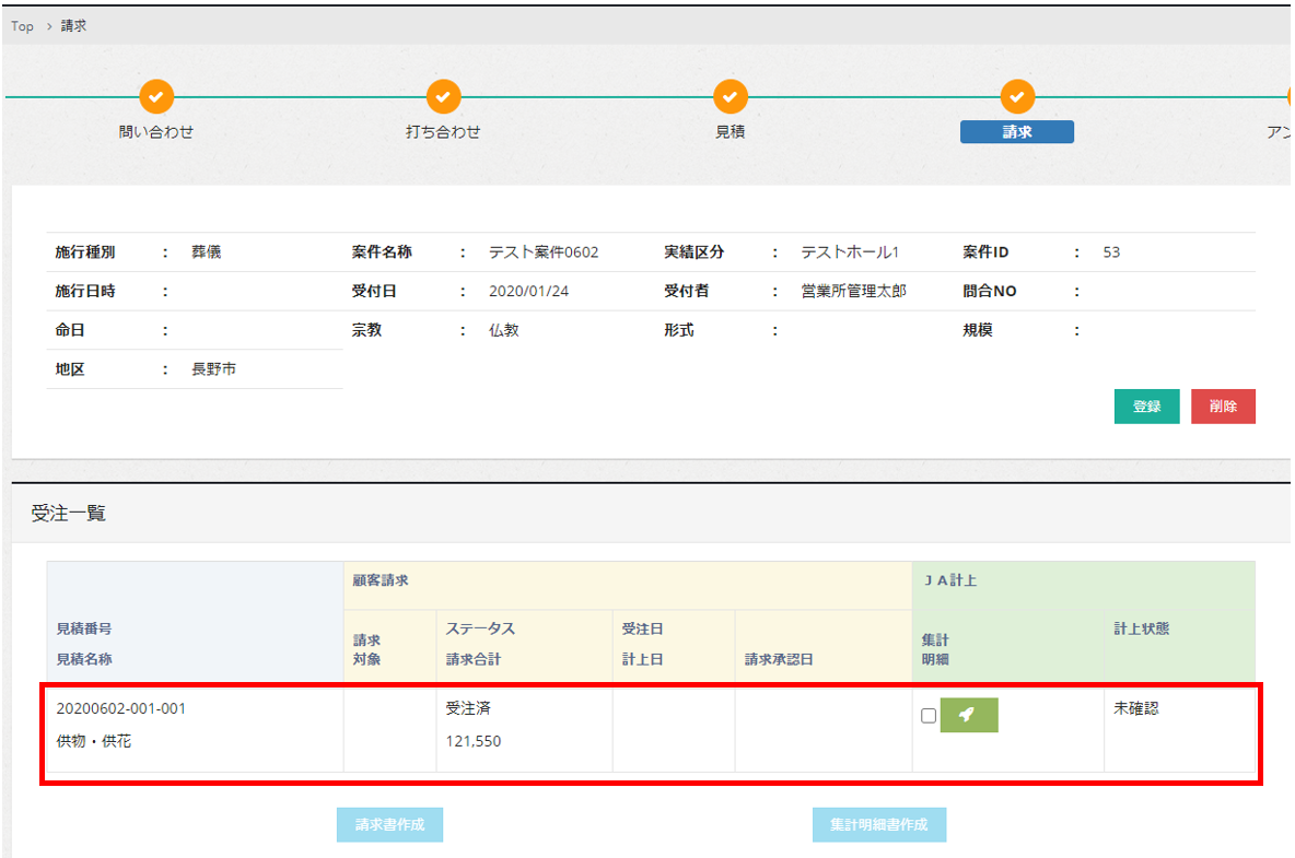 供物・供花一覧から作成した請求は請求画面からも表示できます。