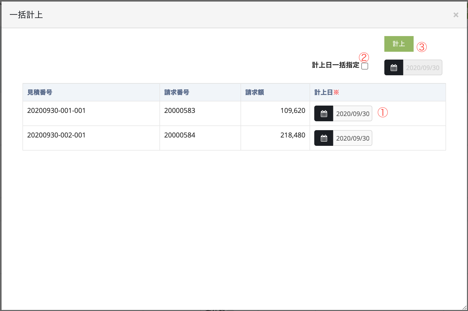 ② 表示されている請求一覧に対して計上日を一括指定したい場合はチェックボックボックスをチェクすると指定の計上日が一覧の全請求に対し設定されます