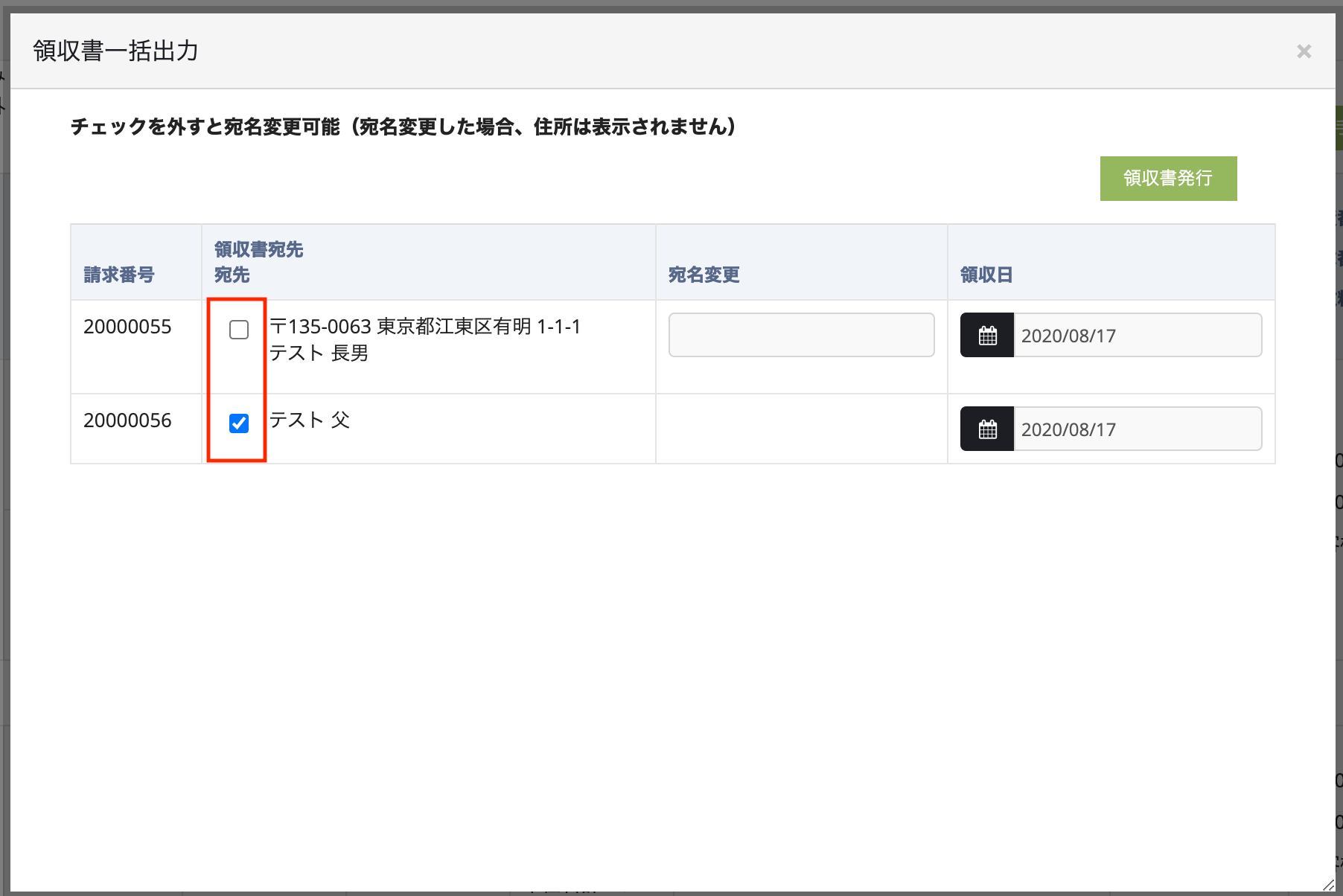 宛名情報はチェックボックスを切り替えることで編集可能です。