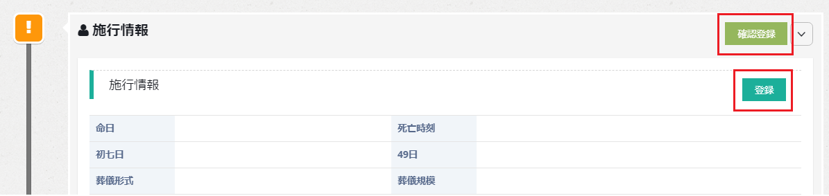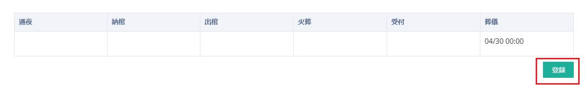 通夜・納棺・出棺・火葬・受付・葬儀については、右下の登録ボタン、もしくは各項目から日時を登録すると、予定欄に日時が表示されます