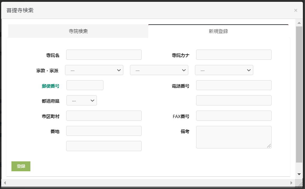 菩提寺検索ボタンをクリックして、菩提寺検索モーダルで新規登録タブを開きます。