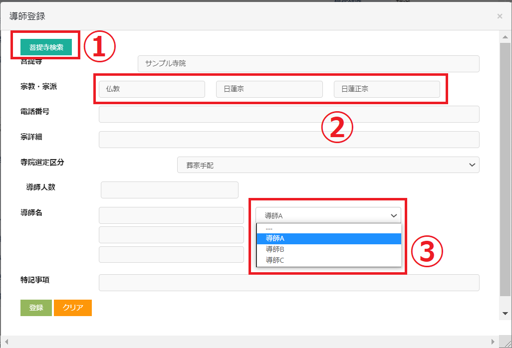 ③寺院・導師マスタで設定した導師情報がプルダウンに表示されるので選択することができます。編集して内容を書き換えることも可能です。ここで編集した内容が寺院・導師マスタに上書きされるということはありません。あくまで当案件の打合せ情報内のみで編集内容が保存されます。