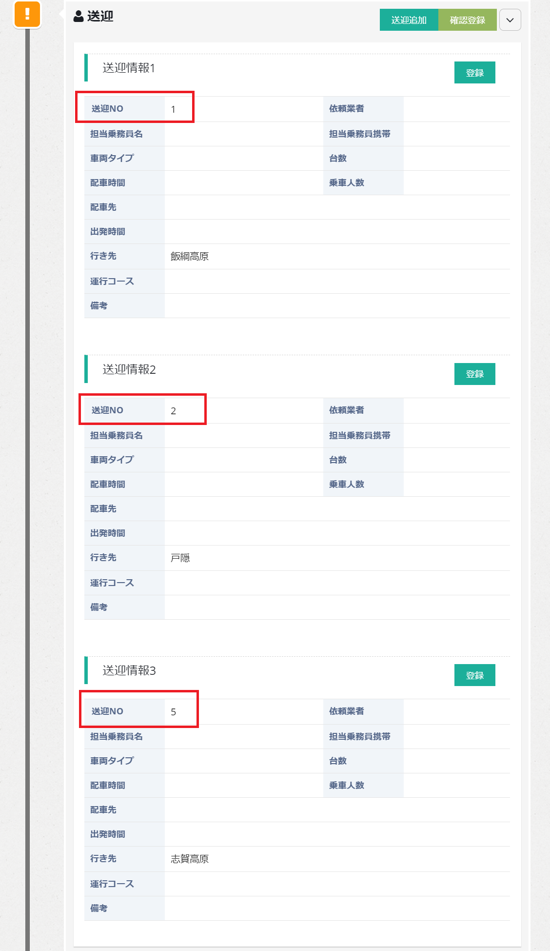 送迎は複数登録が可能なため、送迎Noに入力した数値の昇順で送迎が表示されます。