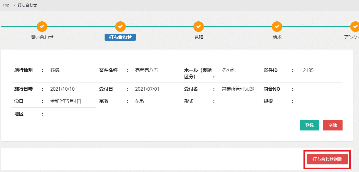 打ち合わせ削除ボタンを押下すると、登録済みの打ち合わせデータを一括で削除できます。