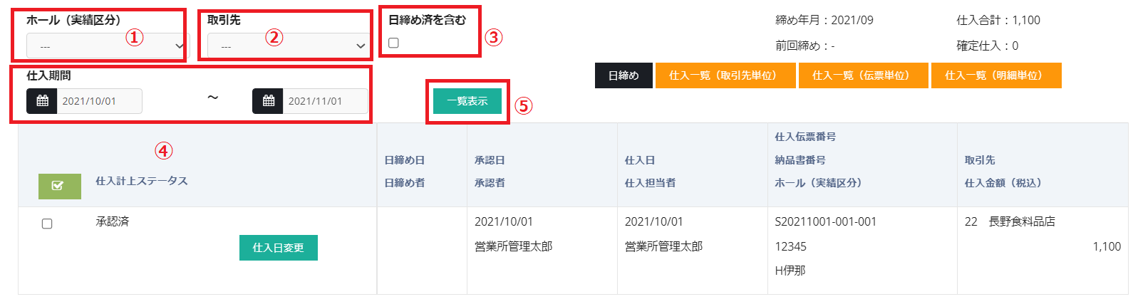 ④で期間を指定してから⑤「一覧表示」ボタンを押すと、承認日が指定した期間に含まれる仕入データのみを表示します。期間が31日を超える場合や、ヒット件数が1000件を超える場合はエラーメッセージが表示されます。