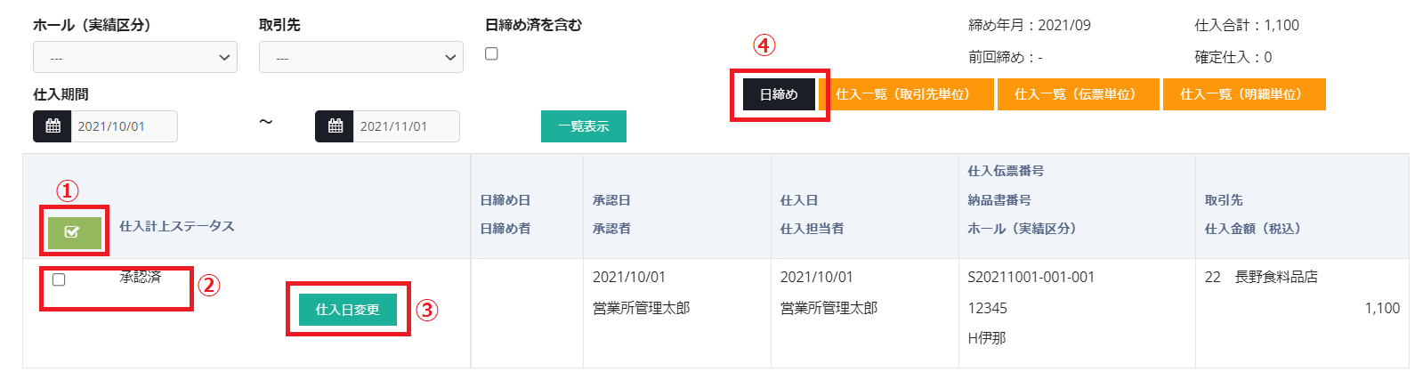 ①, ② により日締めする仕入データを選択後、④「日締め」ボタンを押すと選択した仕入データを日締めします。