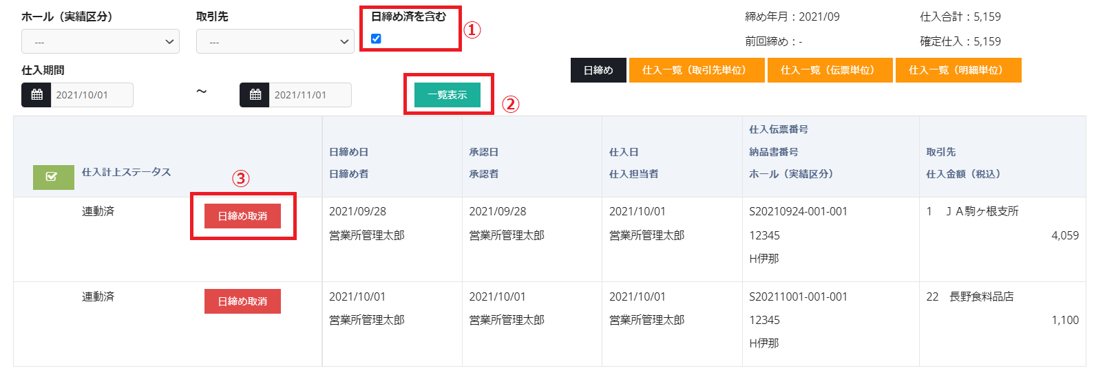 日締め実行後に、①「日締め済を含む」にチェックを入れて②「一覧表示」ボタンをクリックすると、すでに日締めされたデータが表示されます。