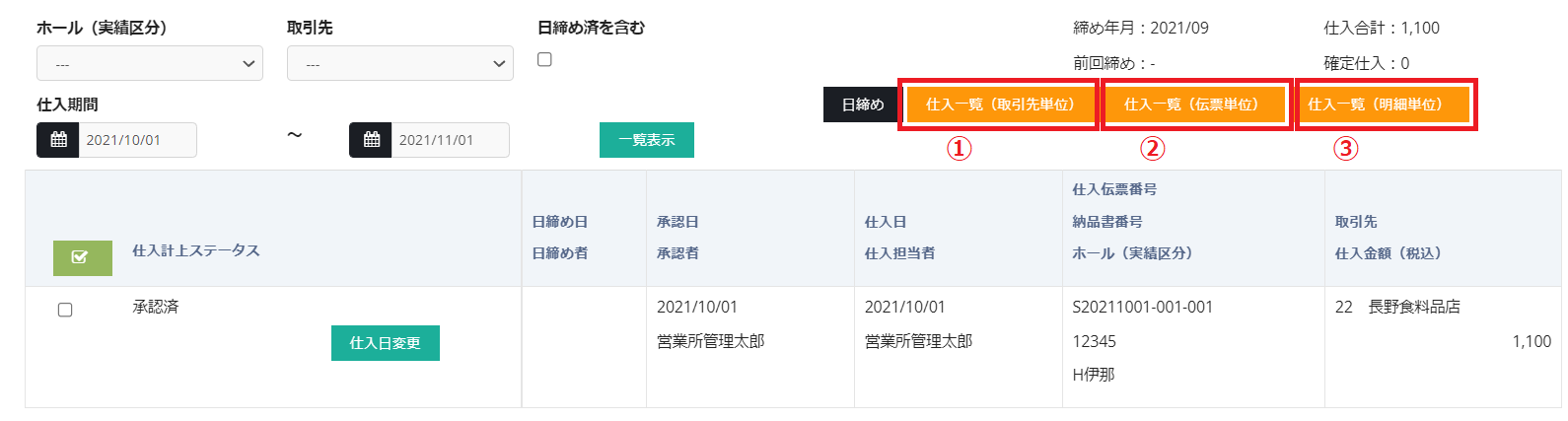 当月の仕入一覧を確認し、日締めを行う画面です。