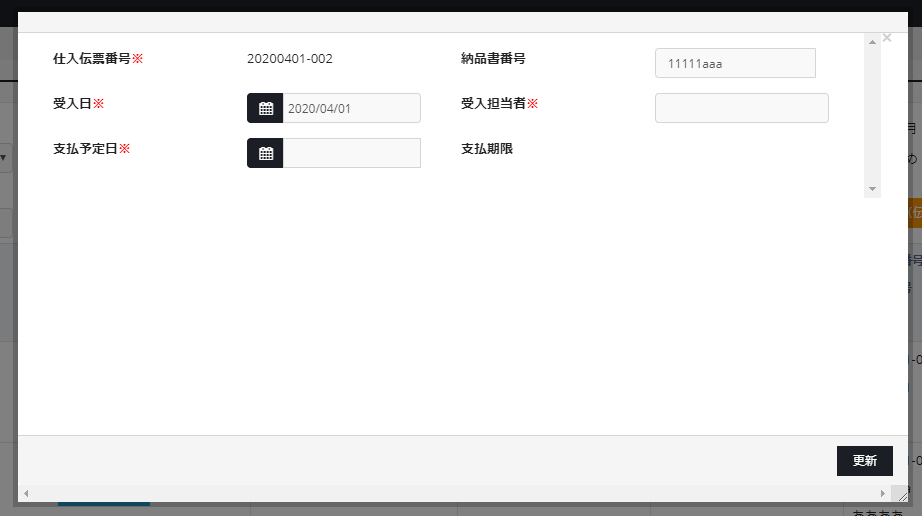 各値を修正後「更新」ボタンを押すと、対応する仕入データを更新します