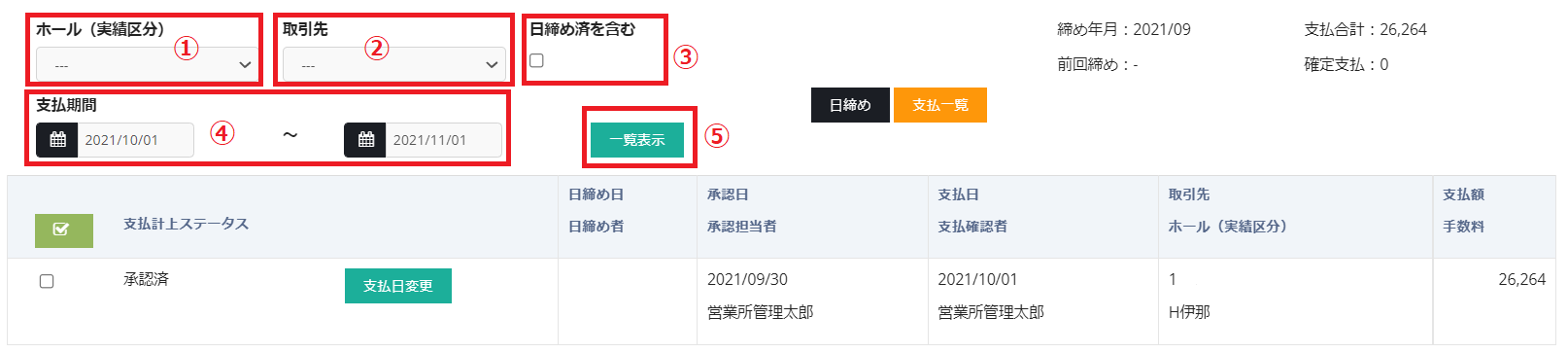 ④で期間を指定してから⑤「一覧表示」ボタンを押すと、支払日が指定した期間に含まれる支払データのみを表示します。期間が31日を超える場合や、ヒット件数が1000件を超える場合はエラーメッセージが表示されます。