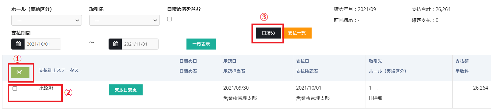 ①, ② により日締めする支払データを選択後、③「日締め」ボタンを押すと選択した支払データを日締めします。