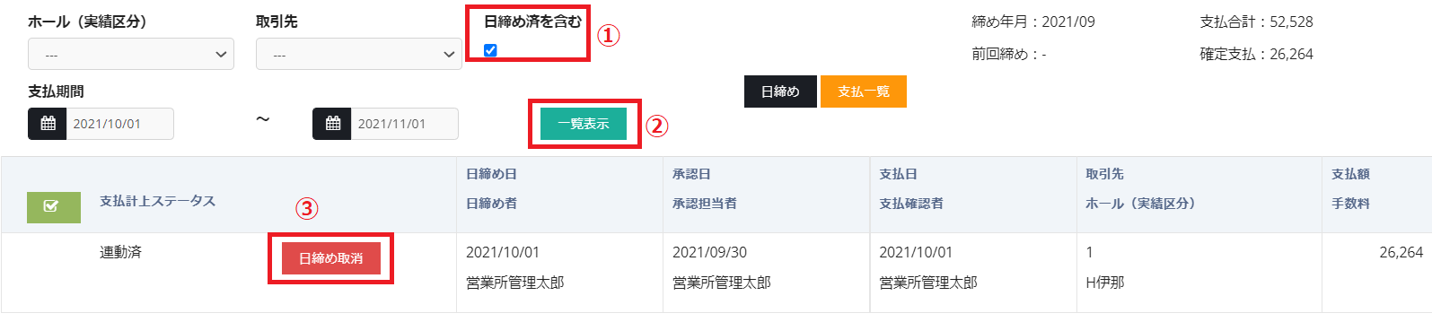 日締め実行後に、①「日締め済を含む」にチェックを入れて②「一覧表示」ボタンをクリックすると、すでに日締めされたデータが表示されます。
