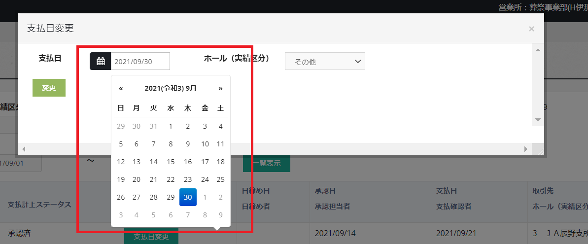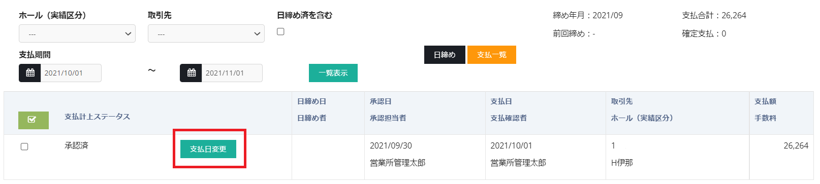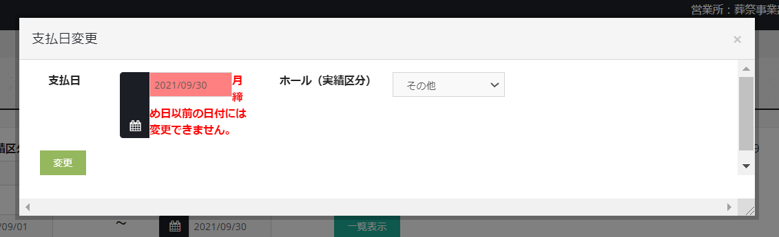 支払日の変更と同様に、支払日変更のボタンから支払ホールも変更することができます。