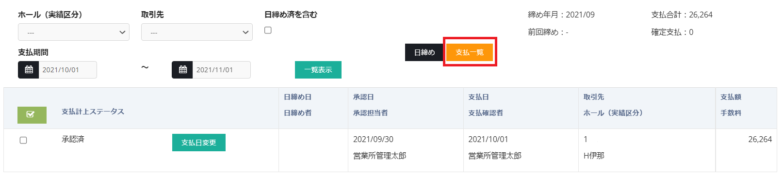 ①からホールを選択すると、選択したホールに紐付く支払データのみを表示します。