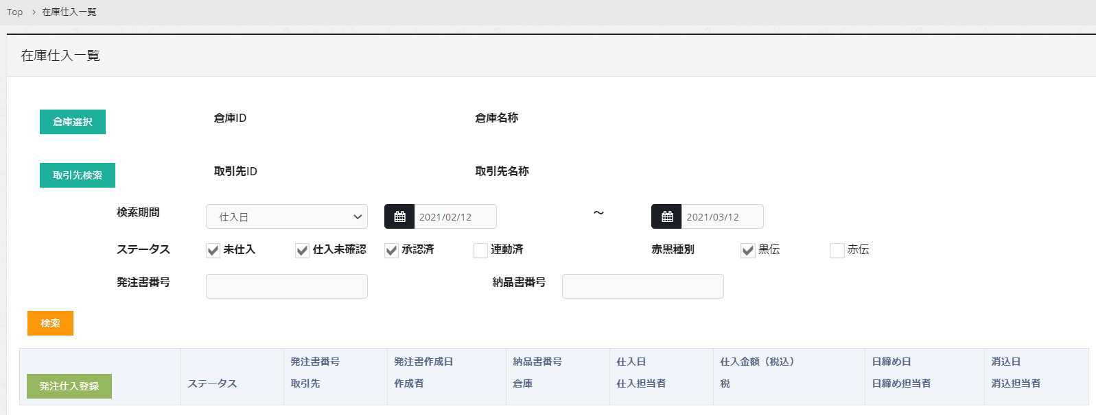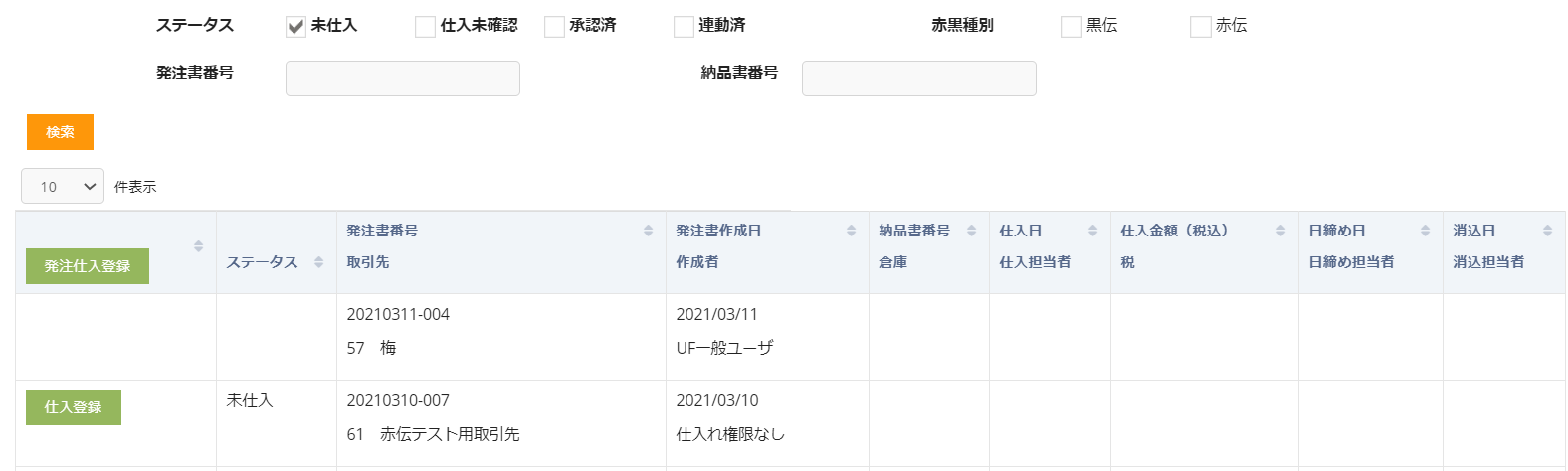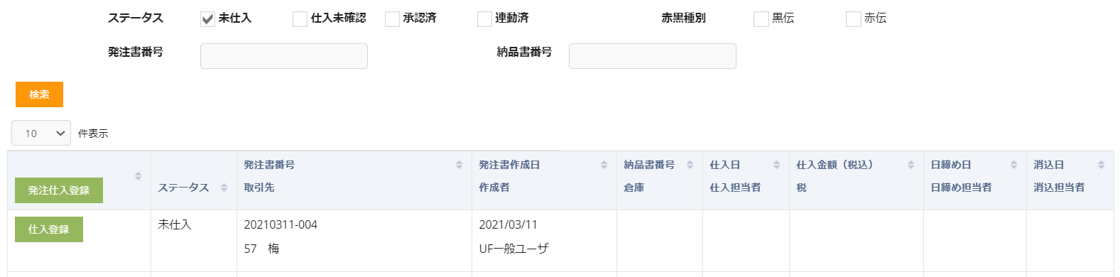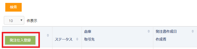 発注書を未作成の場合でも発注仕入登録ボタンクリックで仕入登録が可能です。