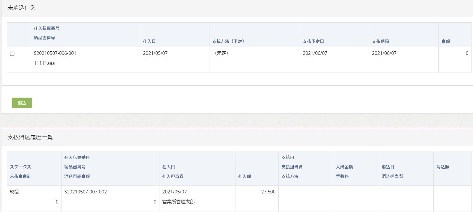 赤伝を発行すると、消込(支払管理)に元になる仕入データが未消込仕入の一覧に表示されなくなりますが、支払消込履歴一覧にはマイナスで打消しした履歴が表示されます