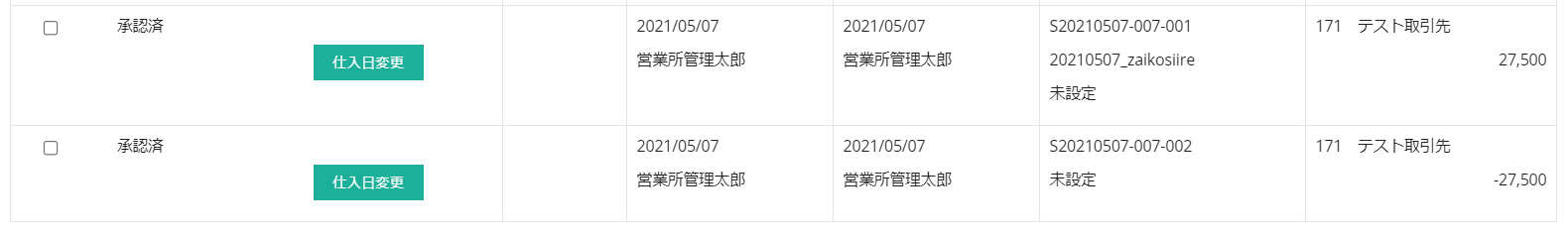 元になる仕入データはそのまま表示されます。マイナスのデータが新規で追加されます。