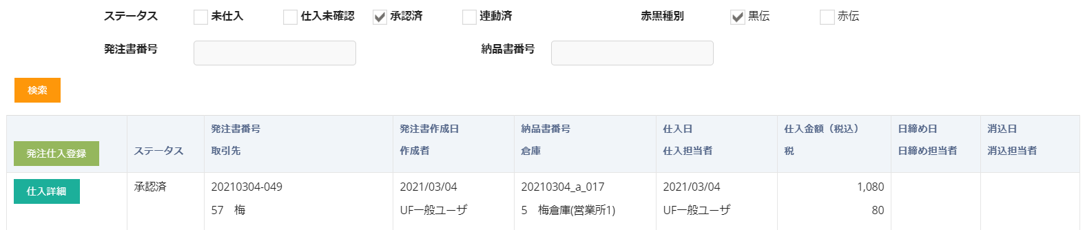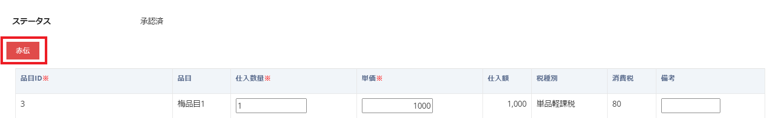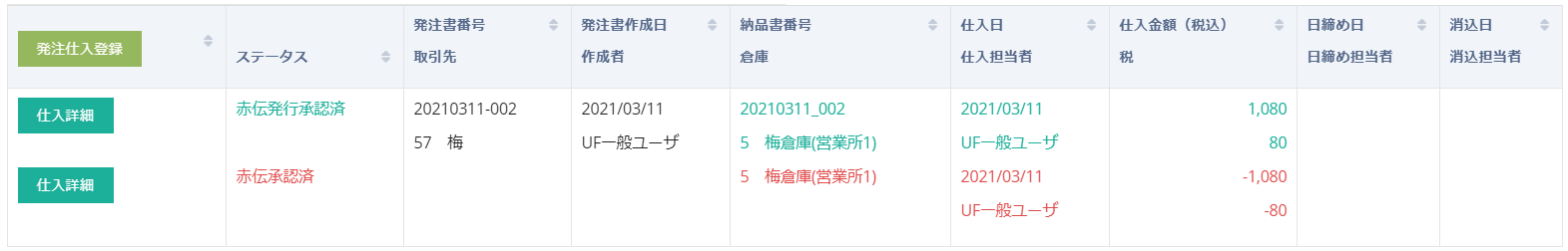 承認ボタンをクリックすると仕入が承認されます。