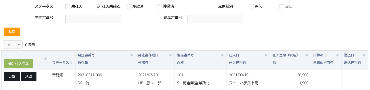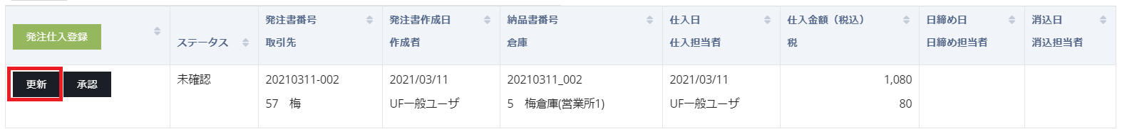 上記の通り、ステータスが未確認のデータ(発注書登録済のデータ)には更新ボタンが表示されます。承認前であればデータ更新が可能です。更新ボタンクリックで仕入情報登録画面に遷移します。