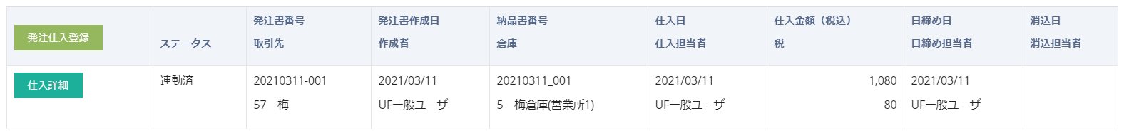 発注書を未作成の場合には仕入登録時に発注書情報を併せて作成します。