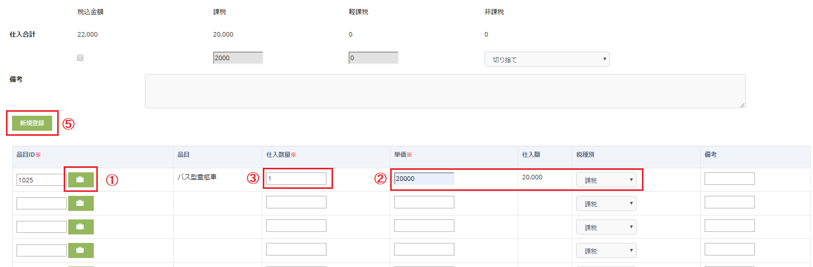 ⑤ 仕入処理したい品目の登録が終わったら「新規登録」ボタンをクリックします