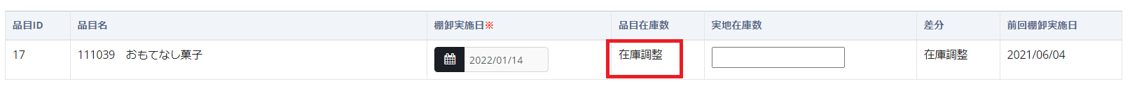 前回「在庫調整」を行った日付が前回棚卸実施日が表示されます