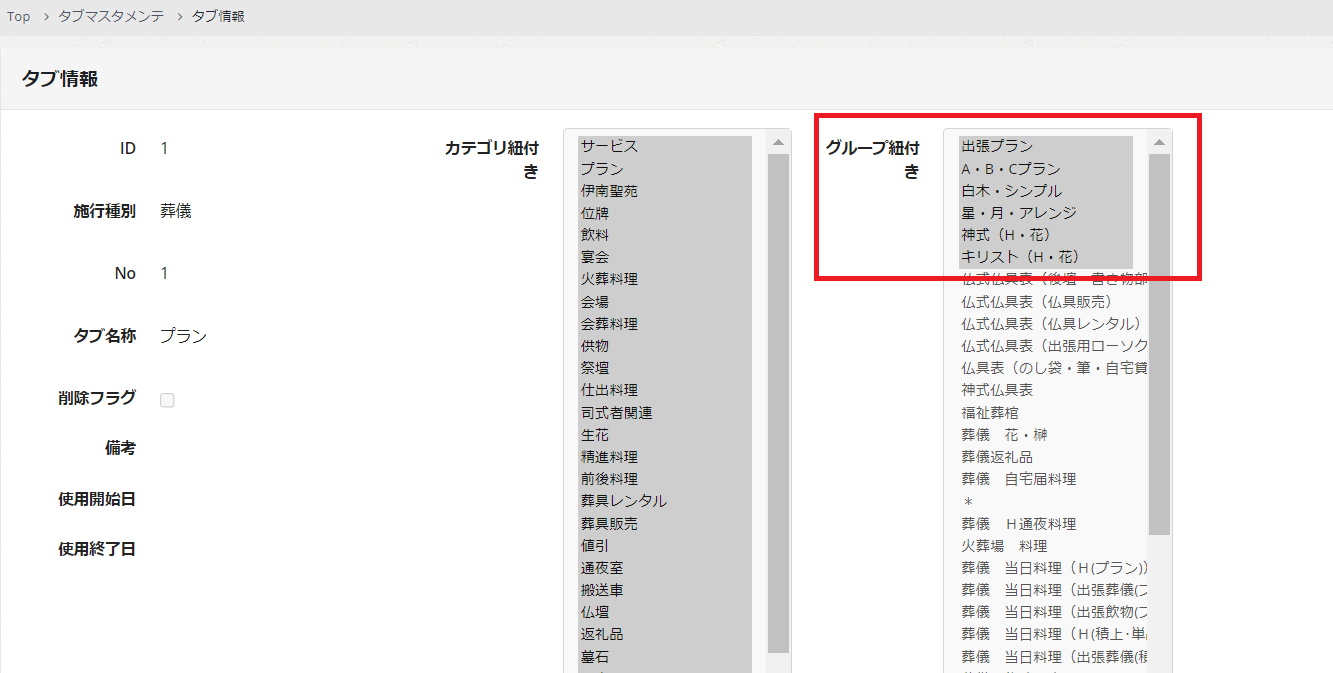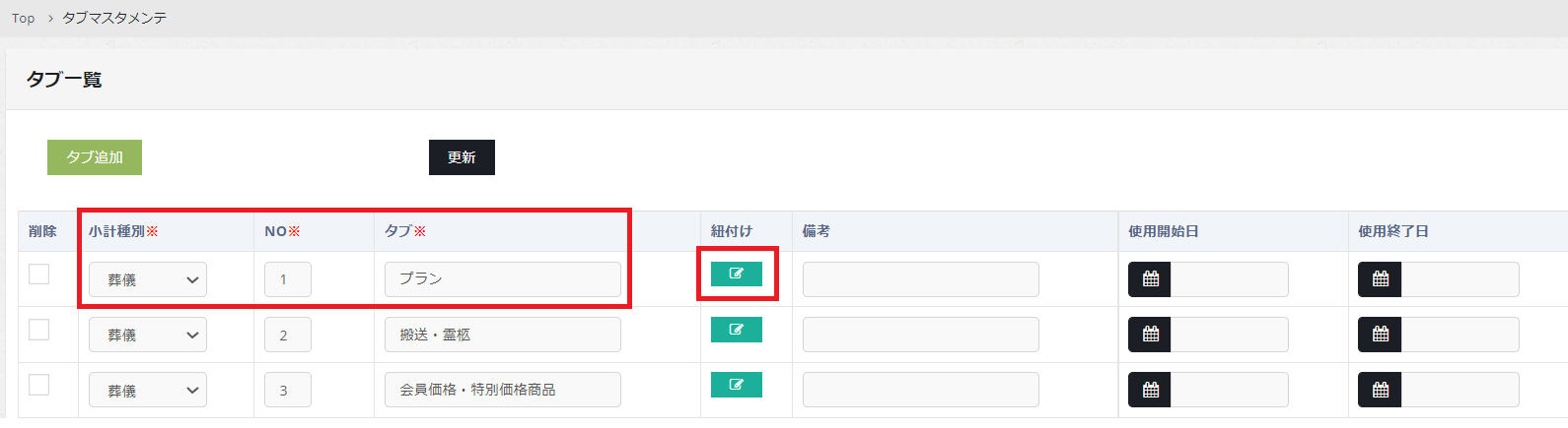 小計種別「葬儀」の見積で、「プラン」タブにグループを追加できるようにしたい場合には、タブマスタで「紐づけ」ボタンを押下します。