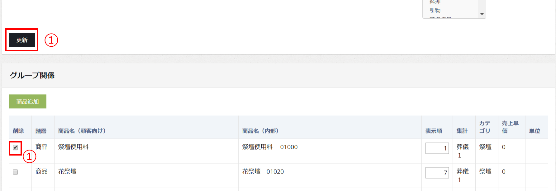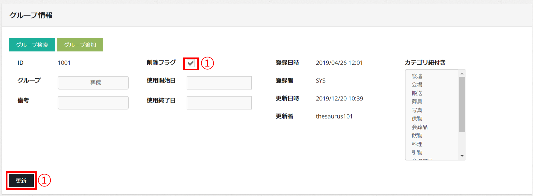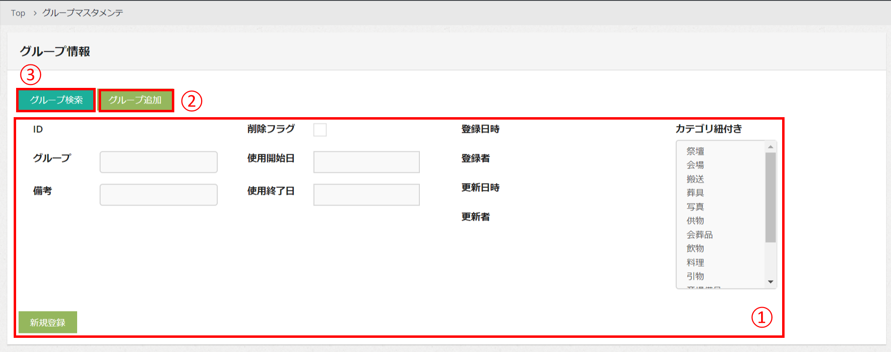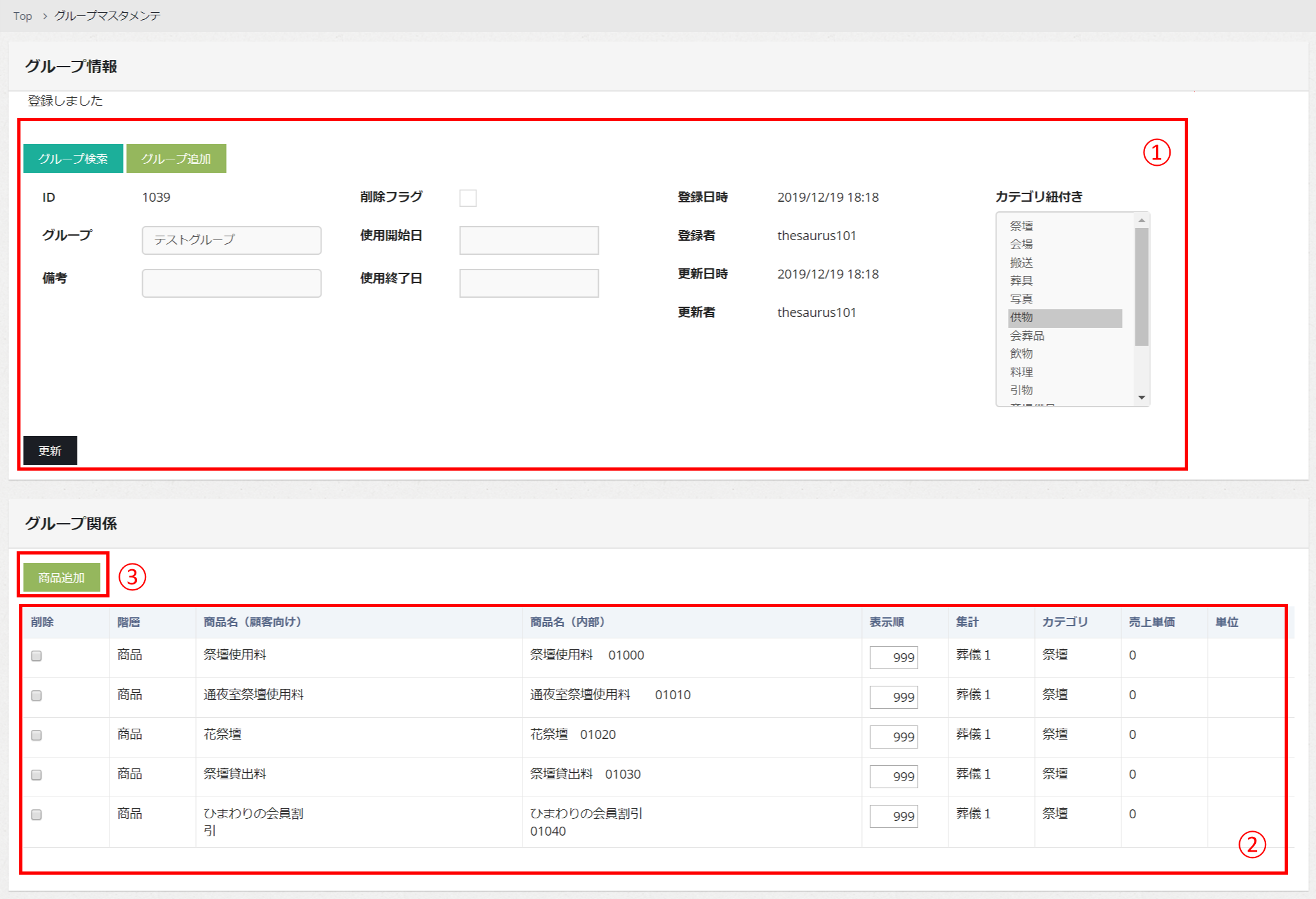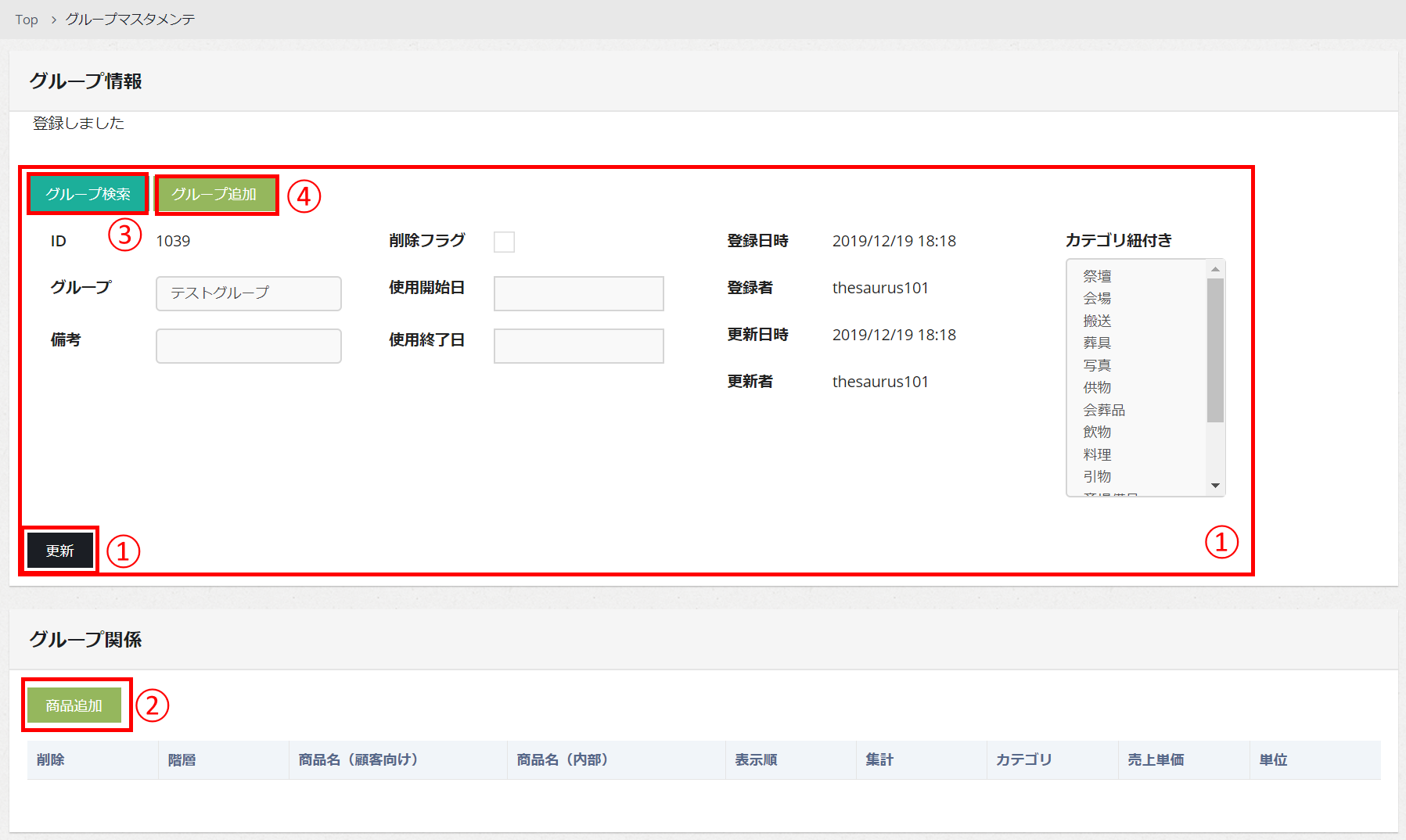 商品をまとめるグループの作成、および内容の編集を行う画面です。