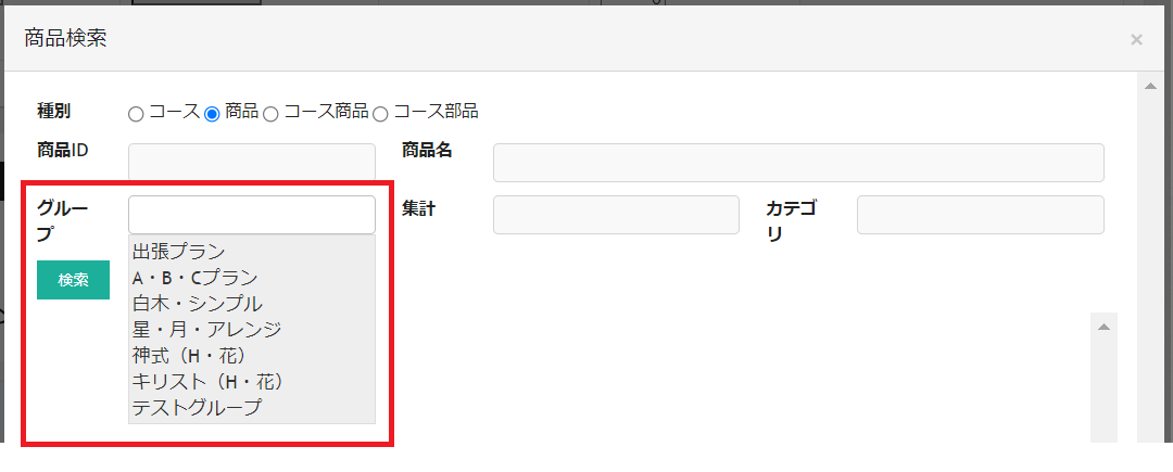 見積作成で商品登録モーダルを呼び出した際に、グループプルダウンに、タブと紐づけをしたグループが表示されます。