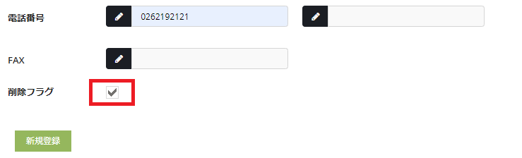 削除フラグにチェックを入れることで、紐づいている品目がないときに、取引先を削除することができます