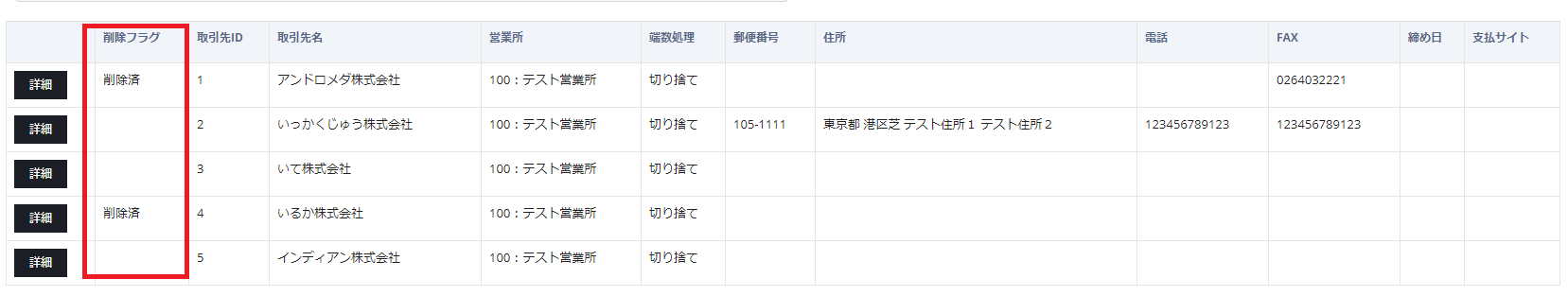 削除フラグにチェックを入れた取引先は、取引先一覧より削除されていることが確認できます