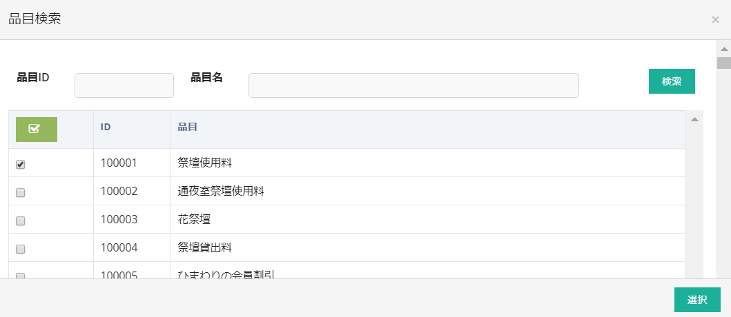 品目検索モーダルが表示されるので、追加したい品目をチェックボックスで選択して「選択」をクリックします。品目の新規追加をしたい場合はこちら