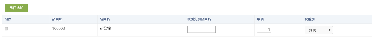 品目が取引先に関連付けされました。こちらの画面から取引先別品目名、単価、税種別の編集も可能です。