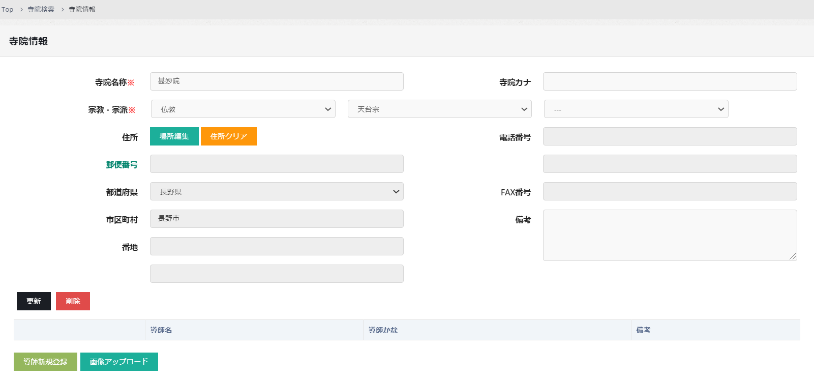 寺院を入力し「新規登録」をクリックすると入力内容が登録されます。