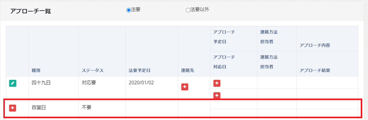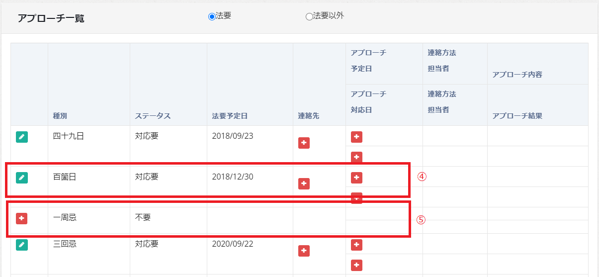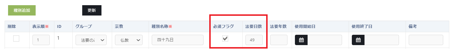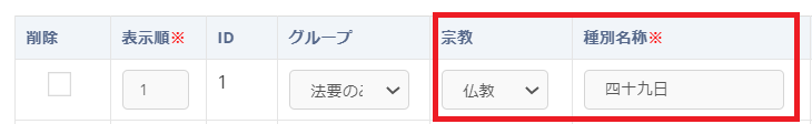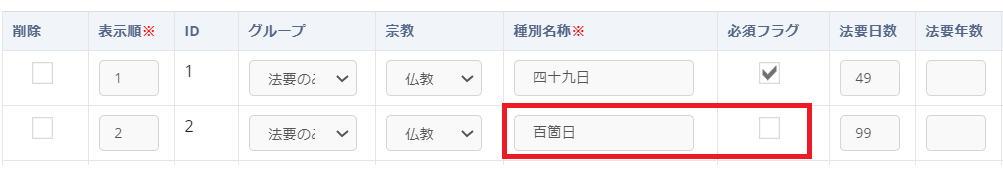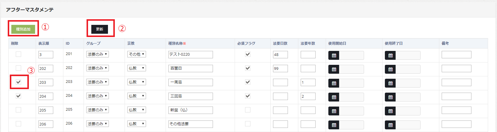 しかし④のようにステータスや法要日などを入力済みの項目は、アフターマスタメンテの削除フラグにチェックをいれて更新をしても削除されません)
