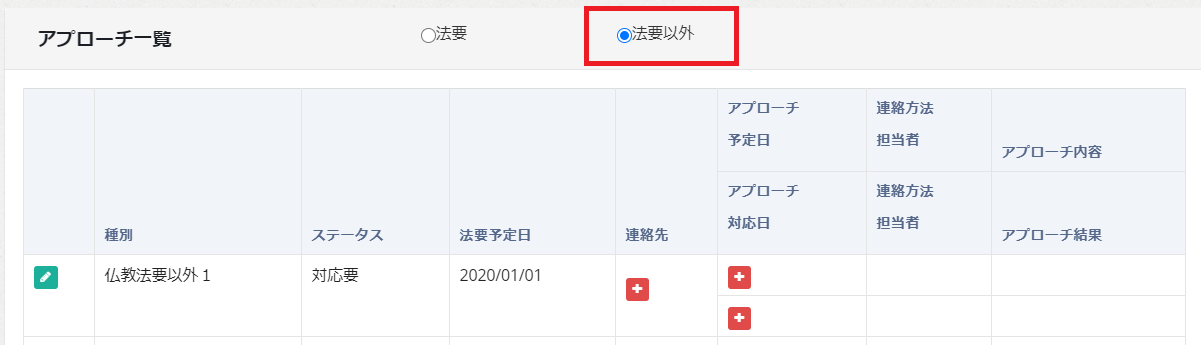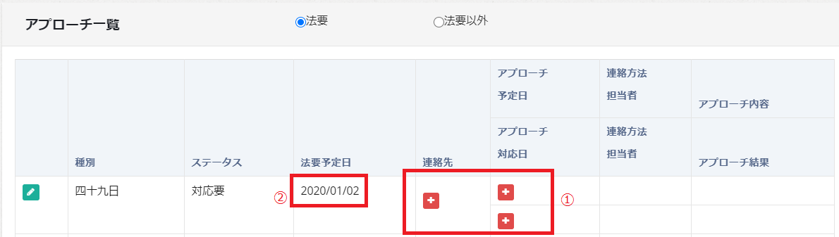 ①アフター画面の種別のステータスが「対応要」に変化し、連絡先・アプローチ予定・アプローチ結果が入力可能となります