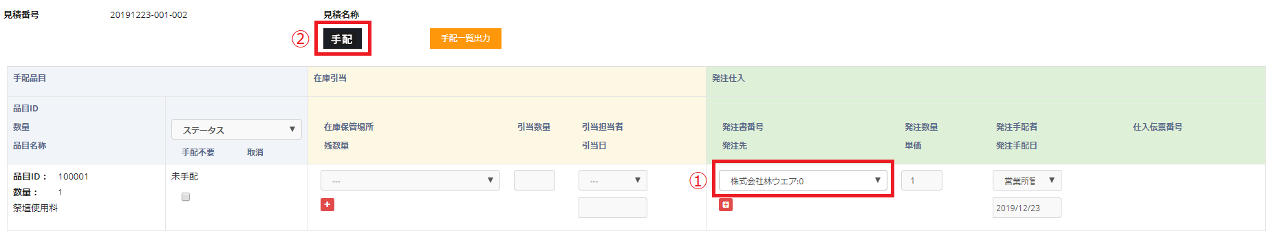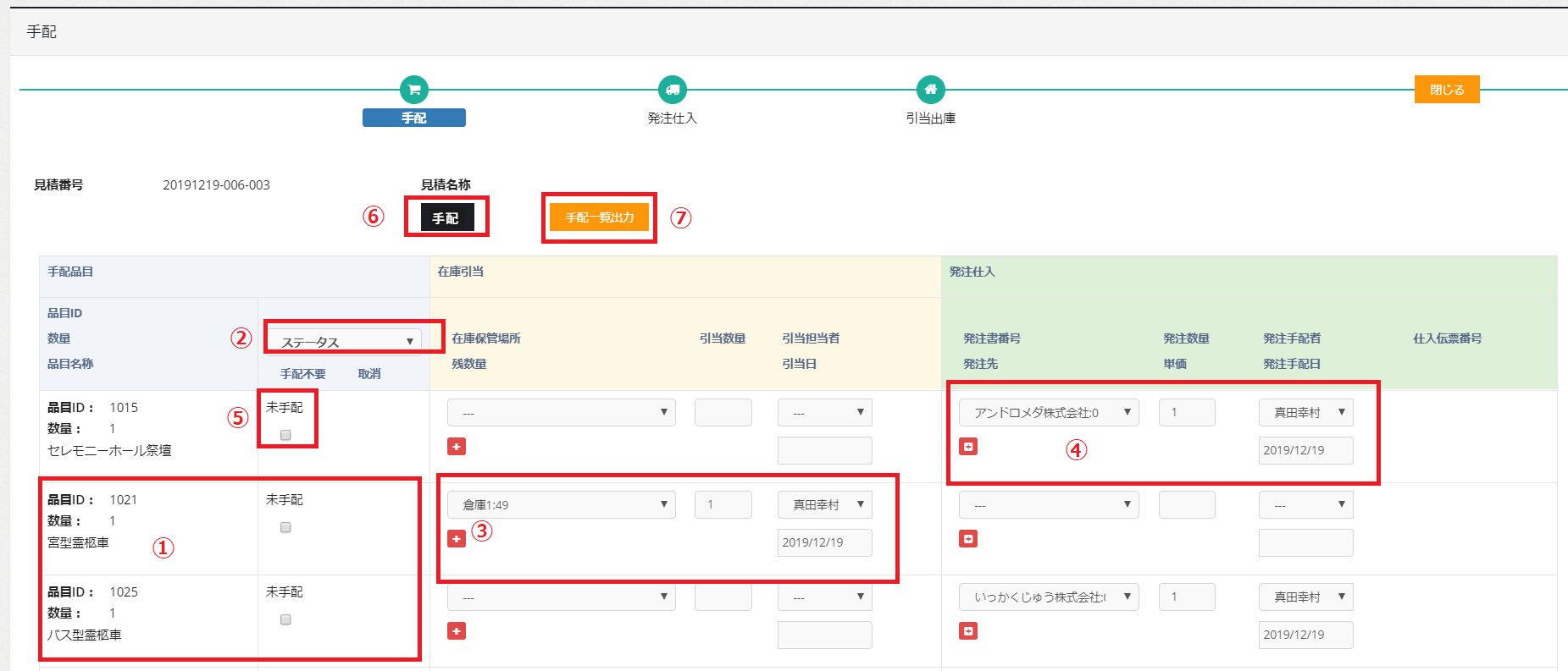 「手配」ボタンをクリックすると、ステータスが更新されます