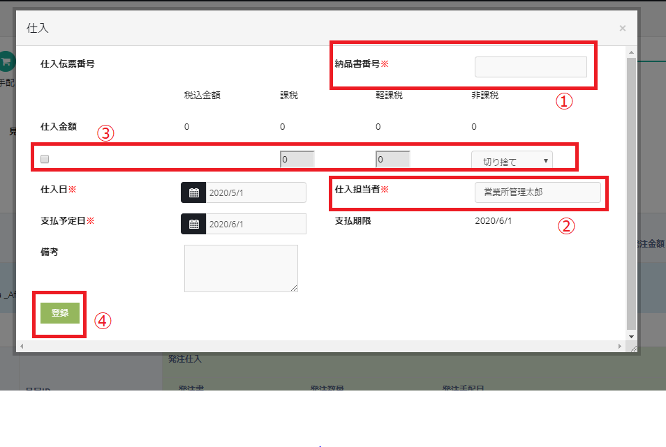※複数の発注先へ発注する場合は、赤い+ボタンをクリックして項目を追加してください