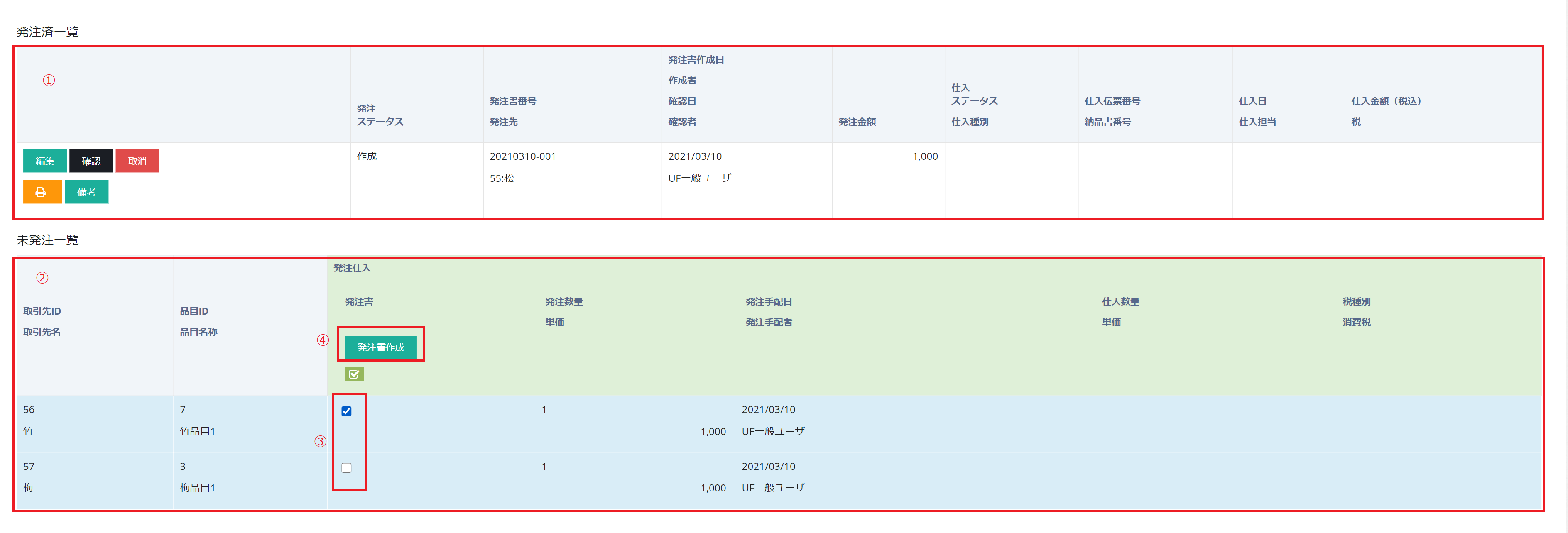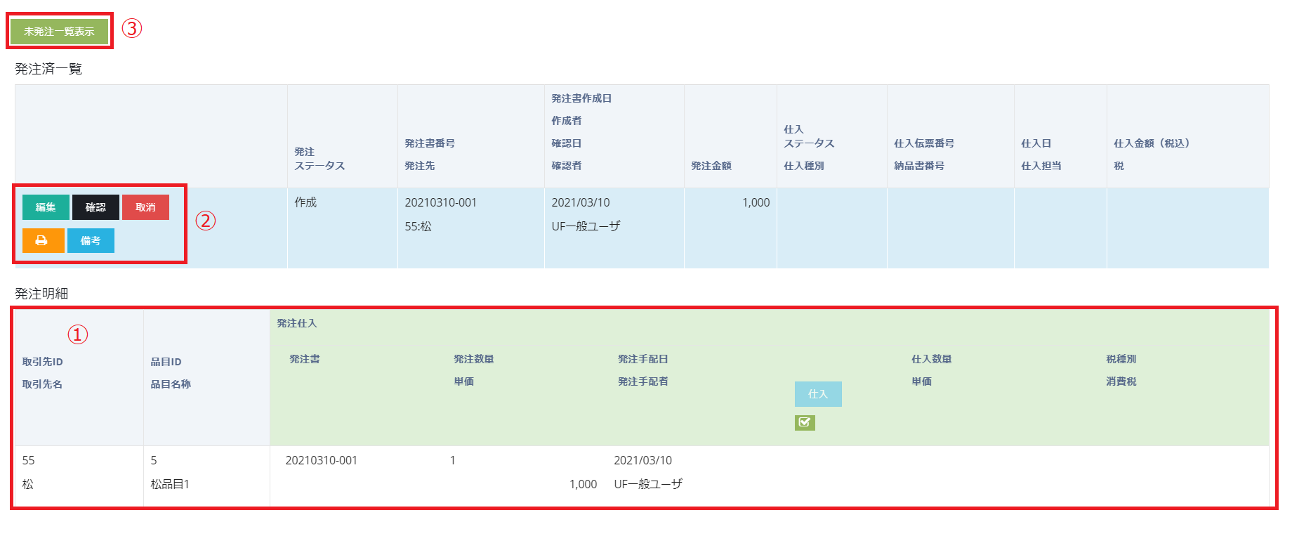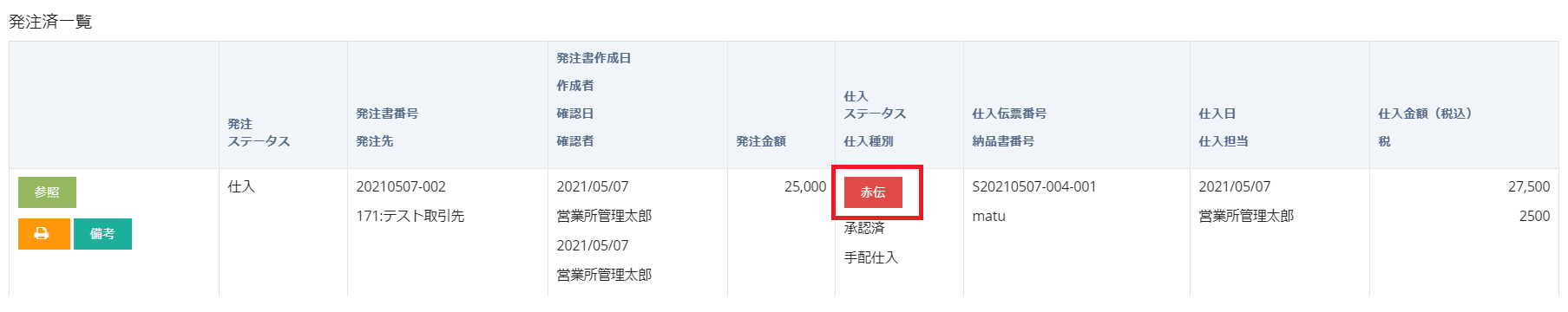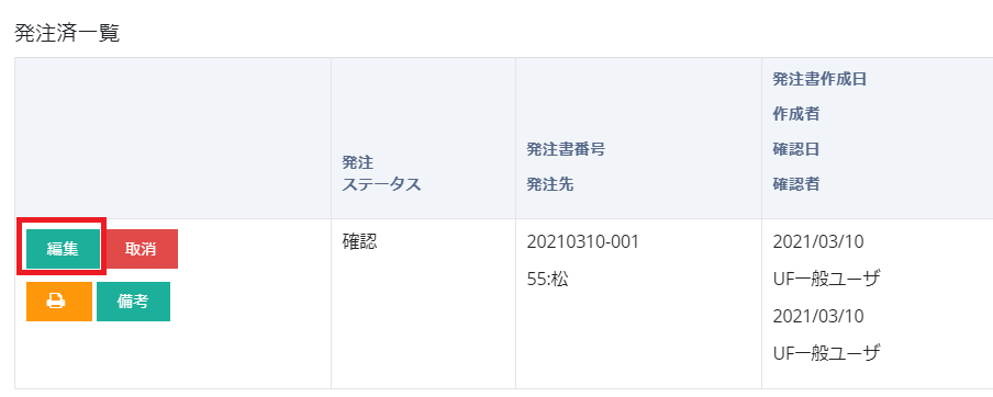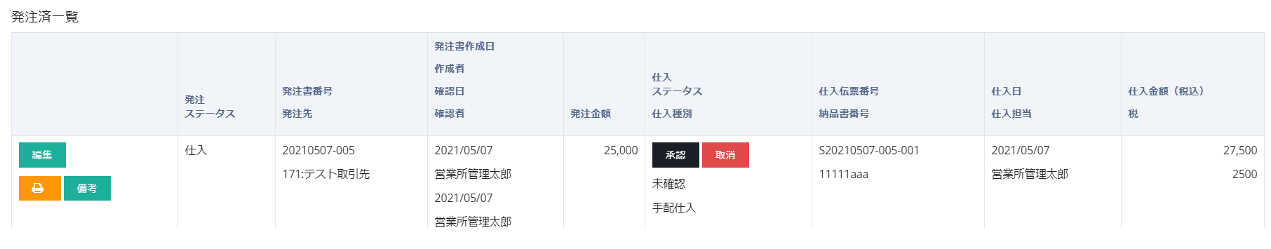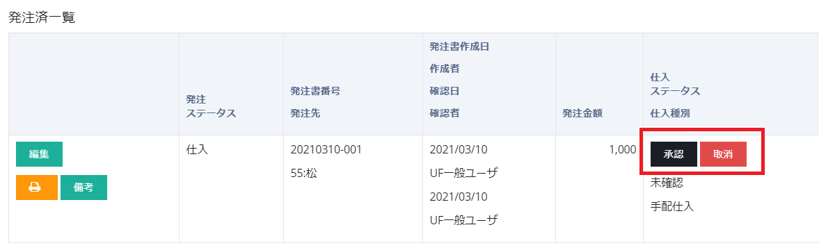 取消ボタンをクリックするとステータスが確認に戻ります。編集ボタンをクリックすると再度仕入処理を行うことができます。